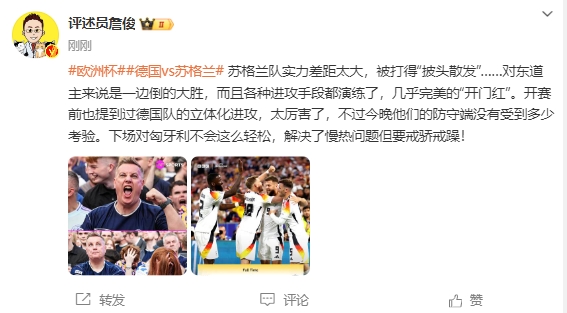 06月15日讯 欧洲杯揭幕战,A组东道主德国5-1横扫苏格兰,赛后著名评述员詹俊在微博发表比赛点评。