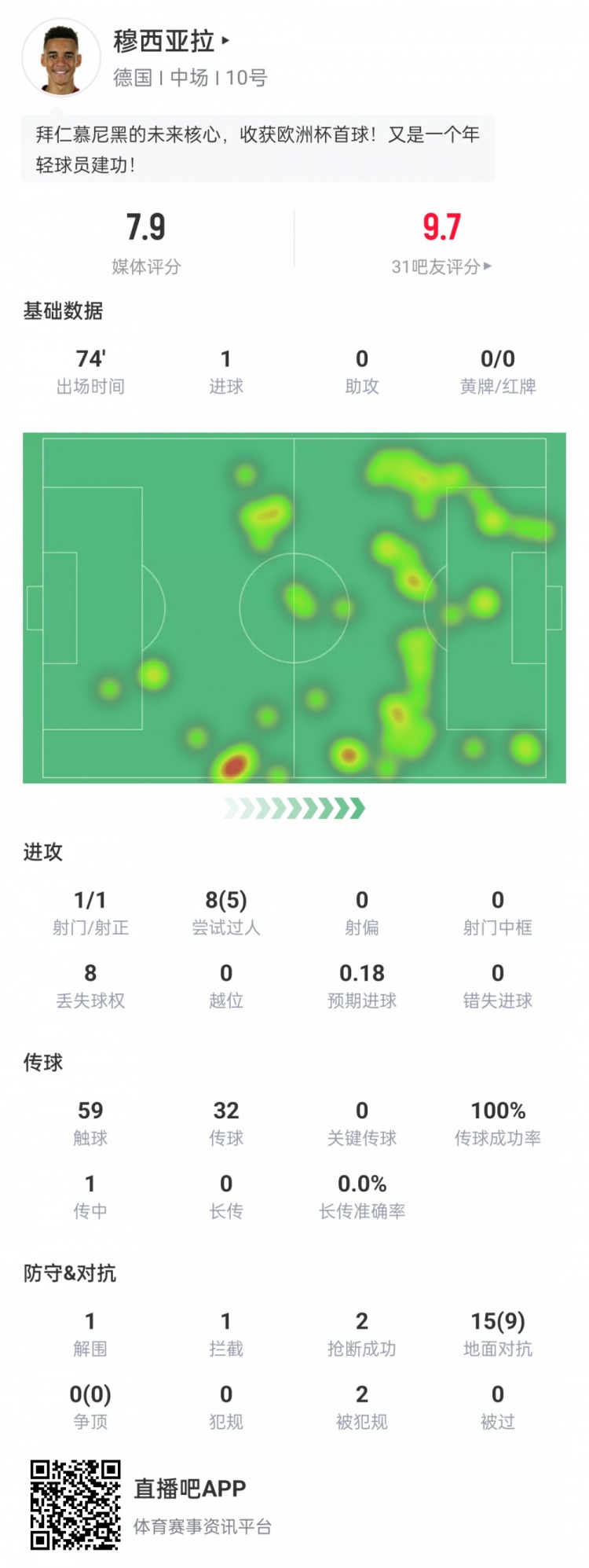 穆西亚拉揭幕战数据:打进1球,100%传球成功率,5次成功过人