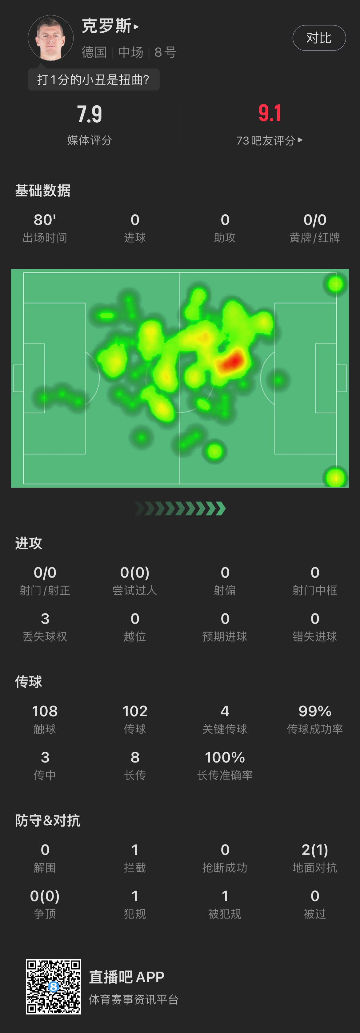完美揭幕战!克罗斯全场数据:99%传球成功率,4次关键传球