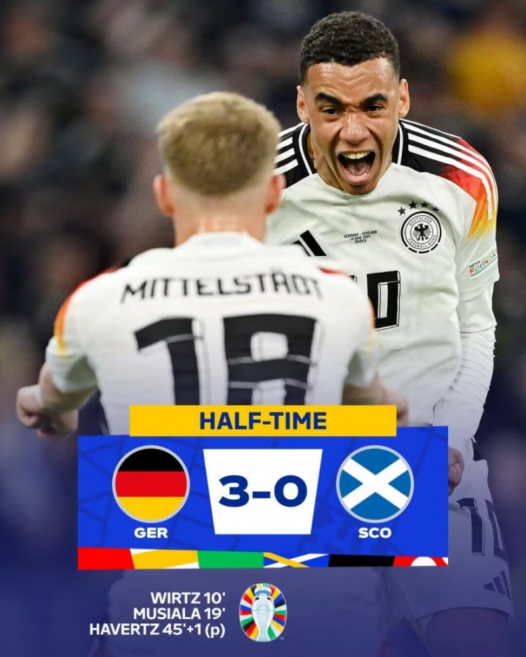半场-维尔茨斩本届欧洲杯首球穆西亚拉哈弗茨破门 德国3-0苏格兰