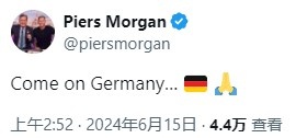 赛前,名嘴摩根发文为东道主加油:“加油,德国…