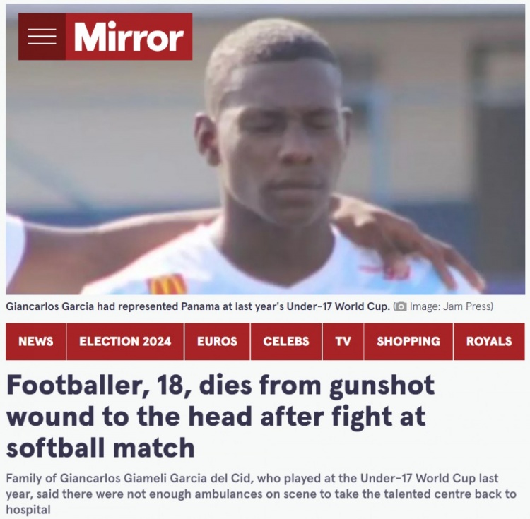 6月15日讯 镜报消息,一名巴拿马足球运动员在观看一场垒球比赛时与其他人发生争吵,随后不幸身亡。这名球员名叫吉安卡洛斯-加西亚(全名Giancarlos Giameli Gar