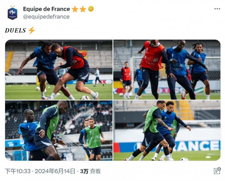 6月14日讯 法国队官方社媒更新动态,晒出球队训练照。法国队已经在欧洲杯驻地帕德博恩进行备战,球队官方社媒晒出球员们训练的照片,同时配文,对抗。法国队欧洲