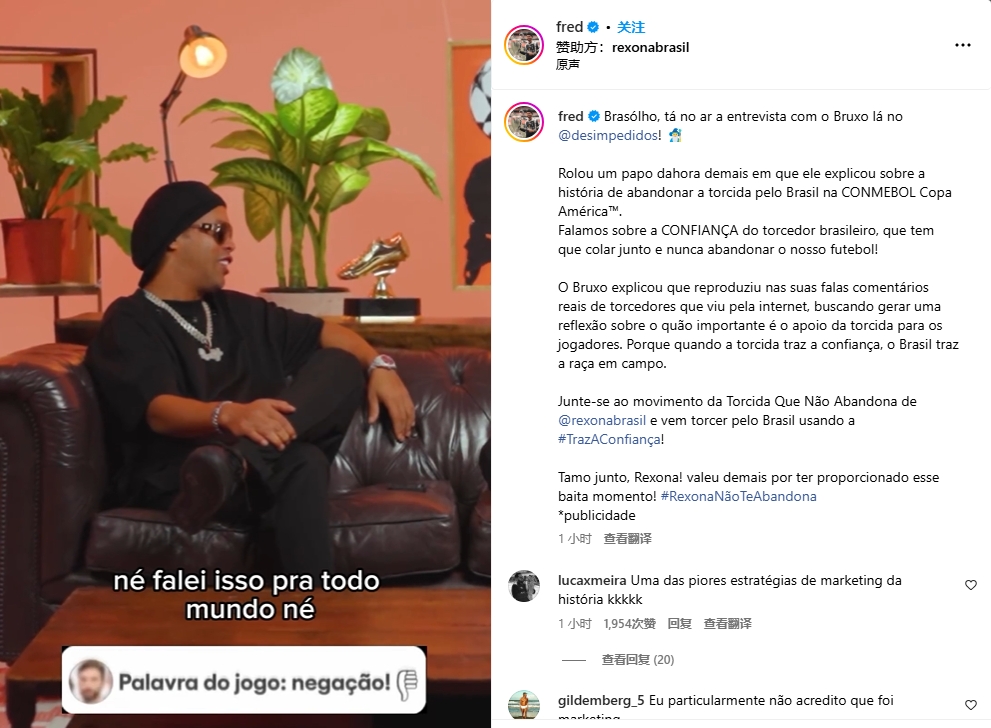 06月16日讯 此前小罗在参加节目时,表示美洲杯一场也不会看,放弃巴西了。该节目的主持人FRED BRUNO发文帮小罗澄清:小罗解释说,他的讲话是巴西球迷真实信息的转