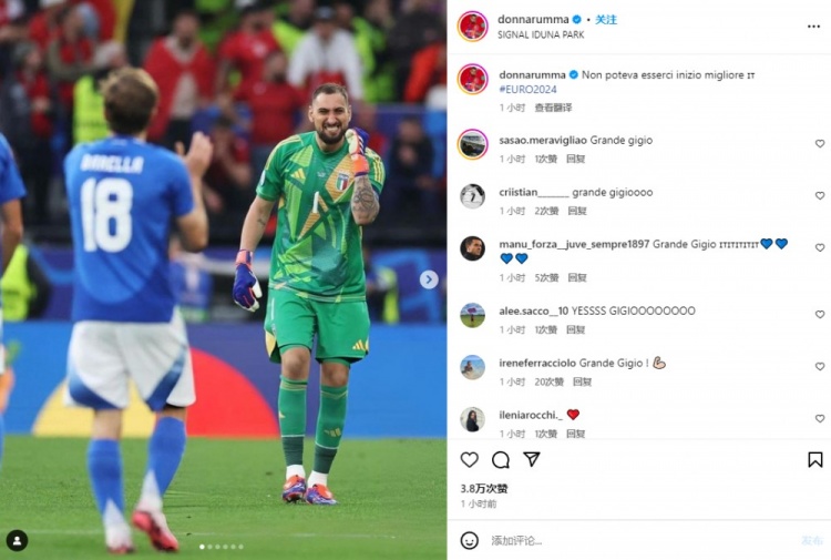 6月16日讯 意大利在本轮欧洲杯2-1逆转阿尔巴尼亚,门将多纳鲁马在赛后庆祝胜利。多纳鲁马晒出了自己在赛后庆祝胜利的照片,并表示:“不可能有比这更好的开局了