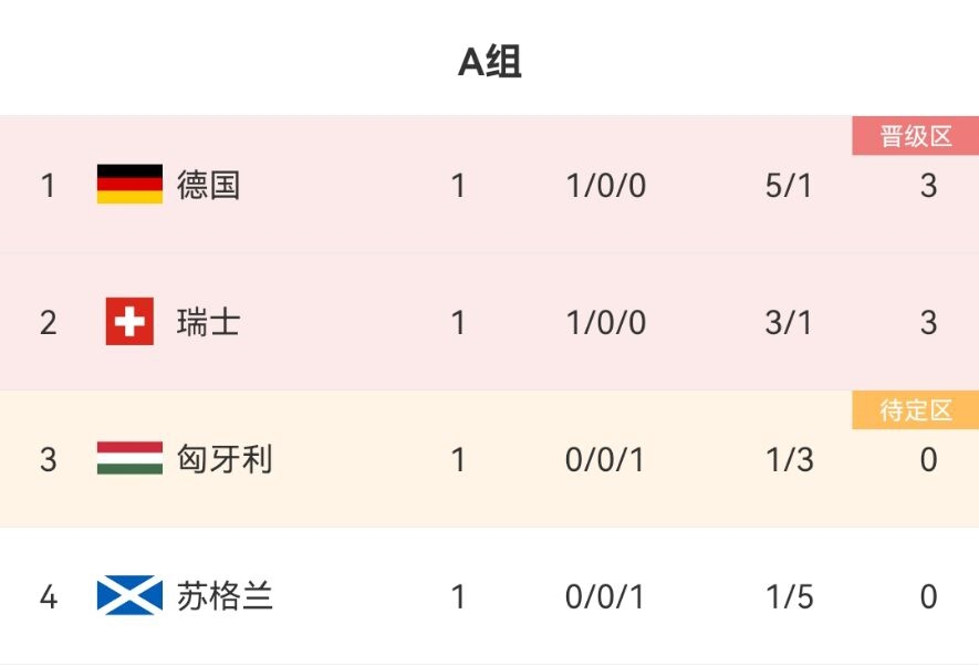 欧洲杯A组积分榜:德国瑞士居一二苏格兰垫底,匈牙利下轮战德国