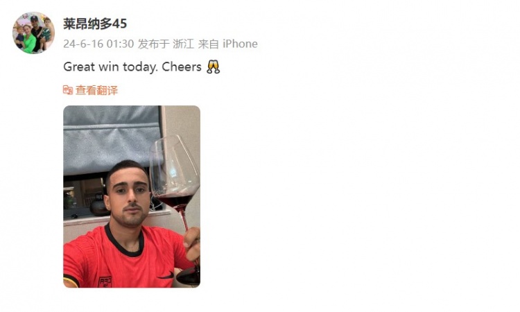 莱昂纳多晒出了自己身穿中国队的球衣饮酒庆祝的照片,并配文:今天赢下了出色的胜利,干杯