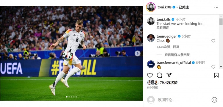 6月16日讯 欧洲杯揭幕战,德国5-1苏格兰开门红。克罗斯赛后更新社媒晒出自己的赛场照庆祝胜利。克罗斯:我们期待中的开局。吕迪格也在评论区点赞评论:大师级