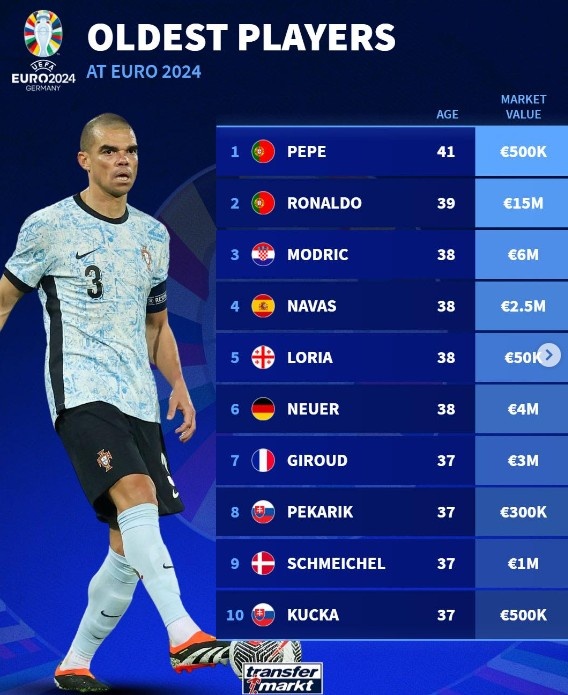 6月16日讯 欧洲杯已经开幕,《转会市场》也列出了本届欧洲杯的最年长球员情况,佩佩以41岁居首。