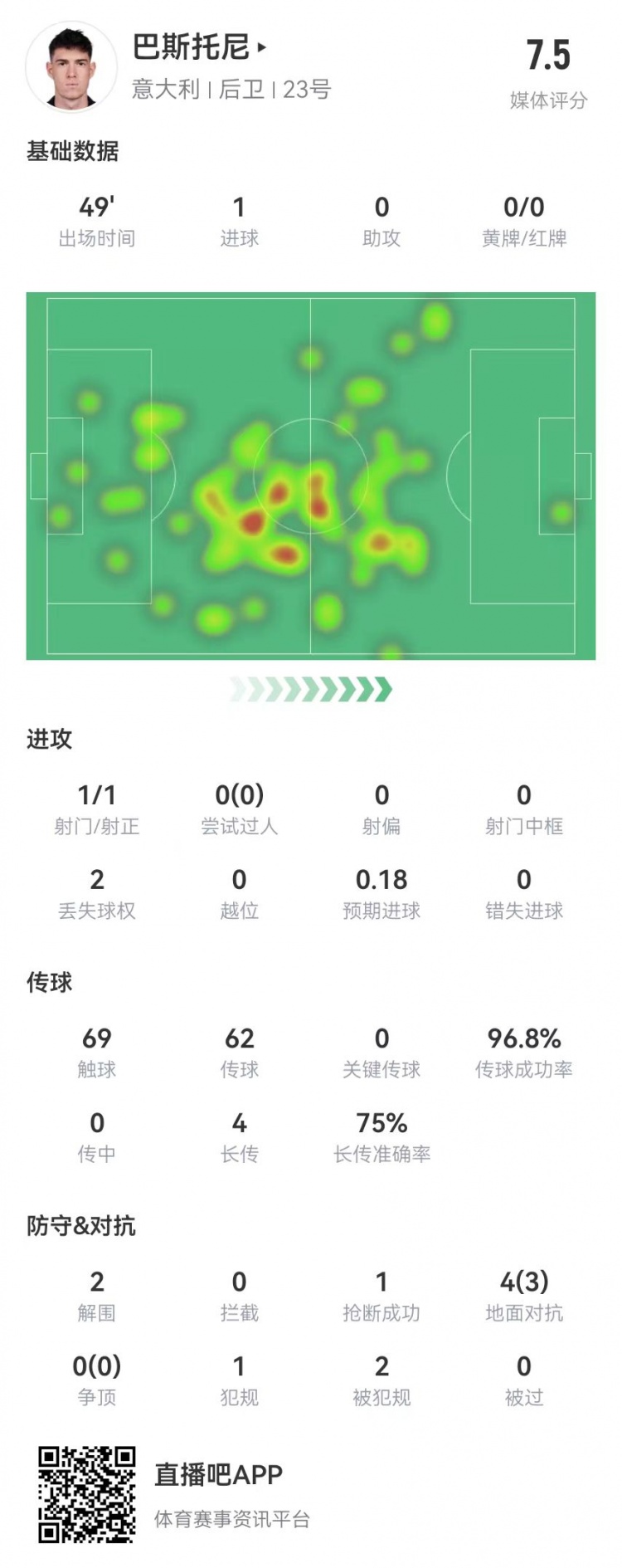 巴斯托尼半场数据:1球+2解围1抢断,获评7.5分