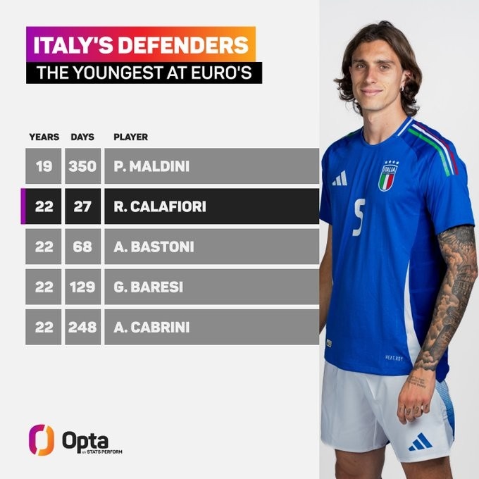 数据统计显示,他是意大利历史第二年轻在欧洲杯完成首秀的后卫球员,仅次于传奇保罗-马尔蒂尼。