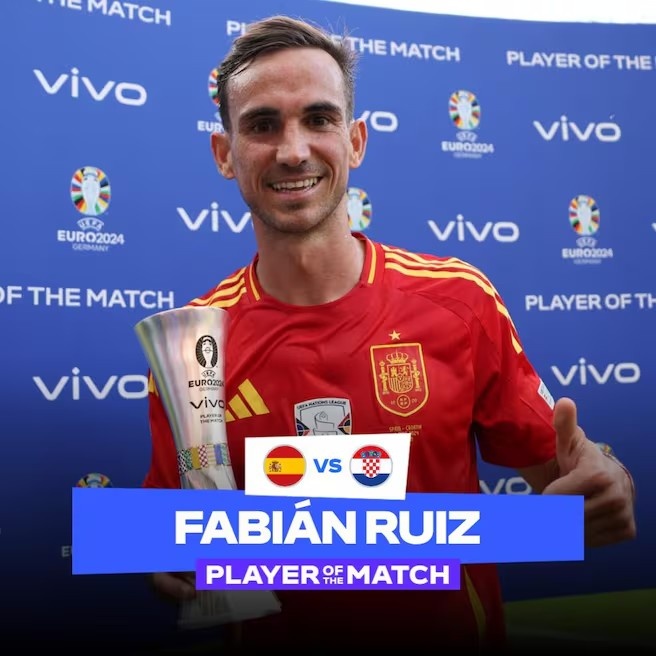 6月16日讯 欧洲杯小组赛B组第1轮,西班牙3-0击败克罗地亚,法比安-鲁伊斯传射建功,赛后被评为全场最佳球员。