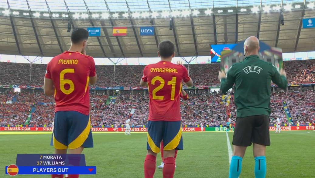 直到1分多钟后再次死球,西班牙才完成换人,奥亚萨瓦尔换下莫拉塔,梅里诺换下尼科-威廉姆斯。