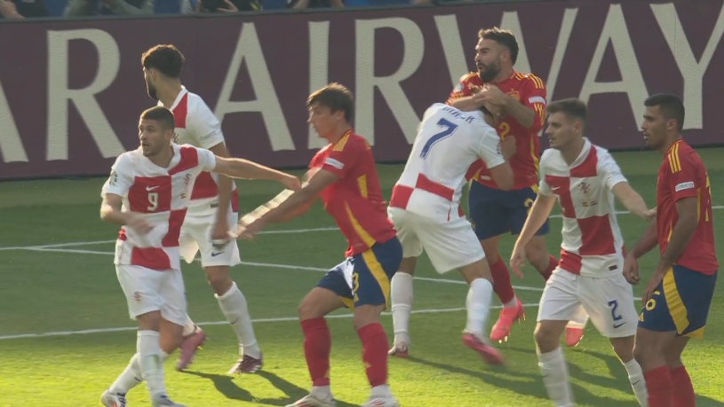 06月16日讯 欧洲杯B组首轮,西班牙vs克罗地亚,比赛第53分钟,西班牙角球开出,回放镜头显示卡瓦哈尔直接双手将马耶尔搂在怀里。