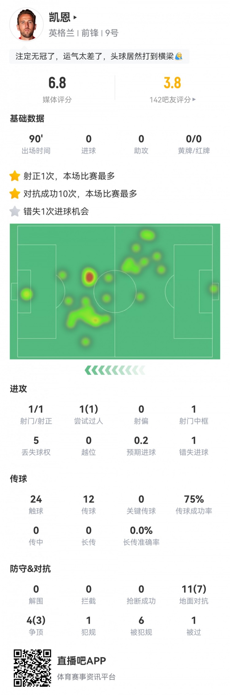 凯恩数据:1射1正,1次中框,1次错失良机,评分6.8全队最低