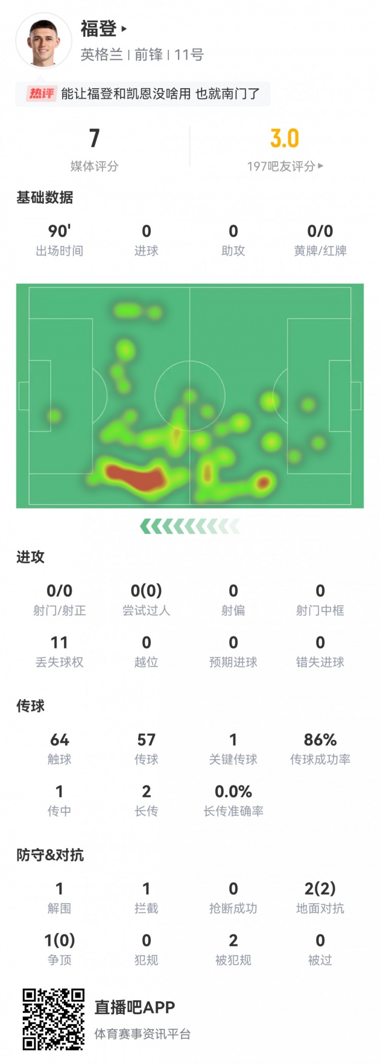 福登数据:0射0正,1次关键传球,11次丢失球权,评分7.0