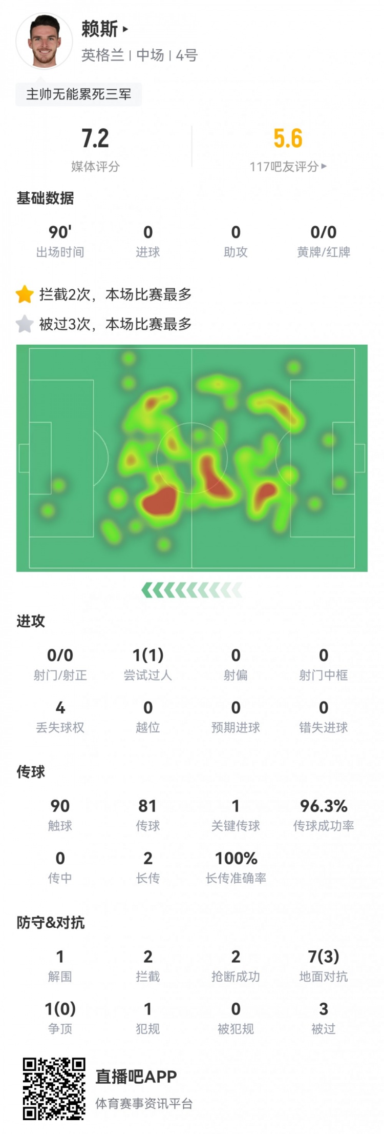 赖斯数据:传球成功率96%,1次关键传球,1解围2拦截,评分7.2