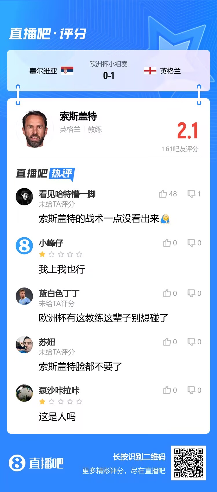 欧洲杯小组赛C组第1轮,英格兰1-0塞尔维亚。吧友给英格兰主帅索斯盖特打出2.1分的低分,来【战报评分栏】发出你的锐评。