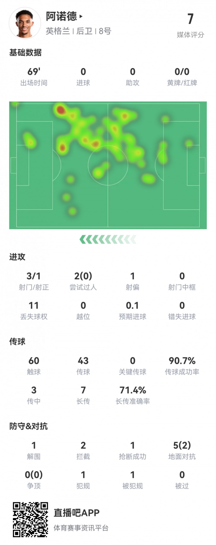阿诺德数据:3射1正,1次失误致对手射门,5次成功长传,评分7.0
