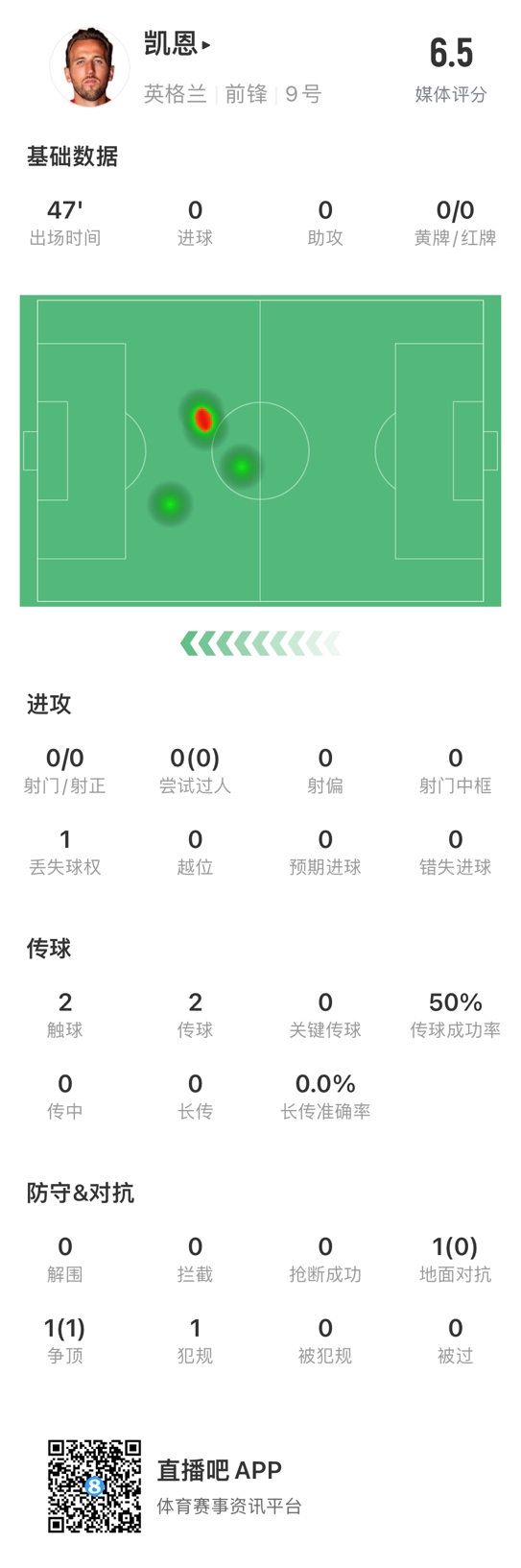 VIP观赛位!凯恩半场数据:47分钟仅2次触球,多项数据挂零