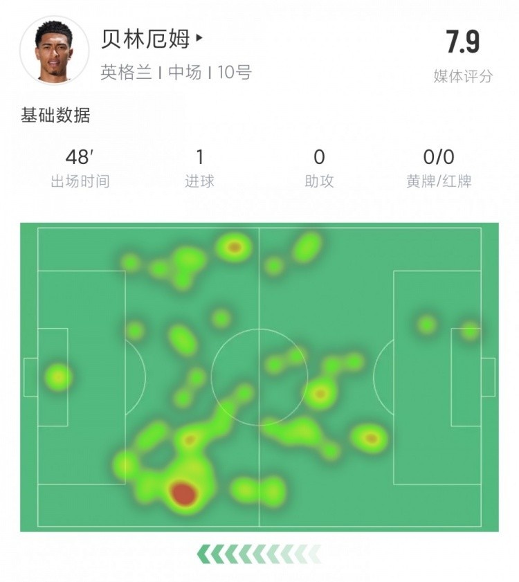 相关阅读:贝林厄姆半场数据:1进球 56次触球 10对抗8成功 评分7.9分