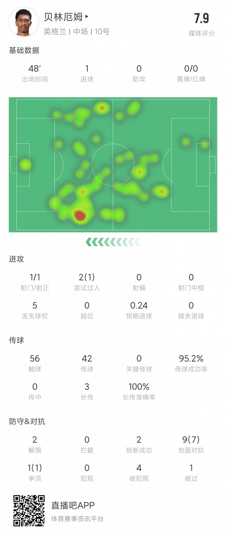 贝林厄姆半场数据:1进球 56次触球 10对抗8成功 评分7.9分