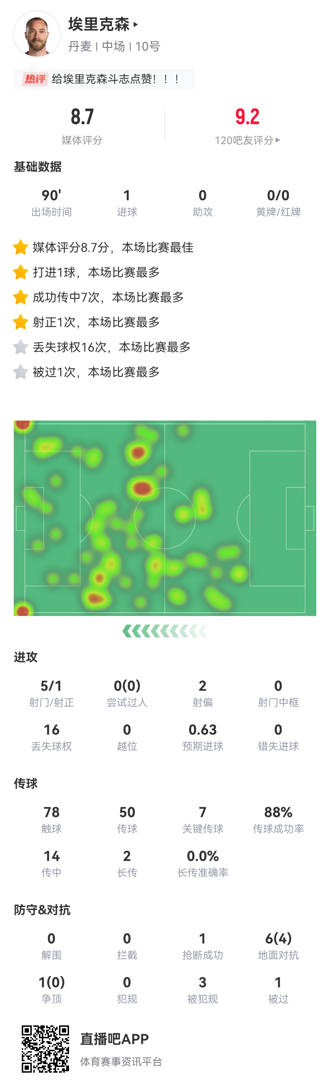归来就是胜利!埃里克森全场数据:传球成功率88%,16次丢失球权