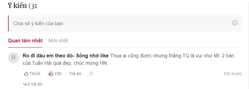 越南媒体vnexpress战报下的第一条热评是:“输给任何人都可以,但赢了中国就和春节一样快乐!范俊海的进球太精彩了,恭喜河内!”