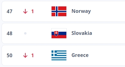 斯洛伐克则位居世界第45,欧洲第25。斯洛伐克身前的挪威甚至没能获得本届欧洲杯的参赛资格。