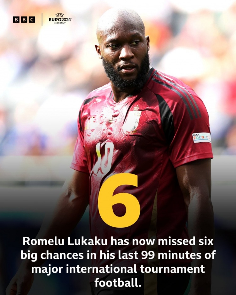 据统计,卢卡库最近99分钟大赛出场一共错失了6次良机。