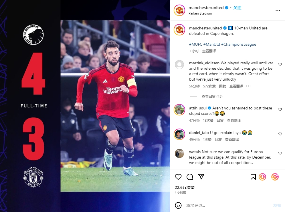 欧冠小组赛A组第4轮,曼联3-4遭哥本哈根逆转,排名A组垫底。赛后,在曼联的官方社媒下,红魔球迷对比赛进行了热议。拉什福德红牌↓