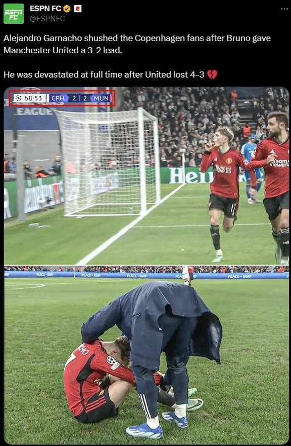11月9日讯 今天凌晨,曼联在欧冠中3-4不敌哥本哈根。ESPN表示,加纳乔在曼联3-2领先时嘲讽了对手球迷,最终输球后情绪崩溃。本场比赛的过程可谓跌宕起伏,曼联上