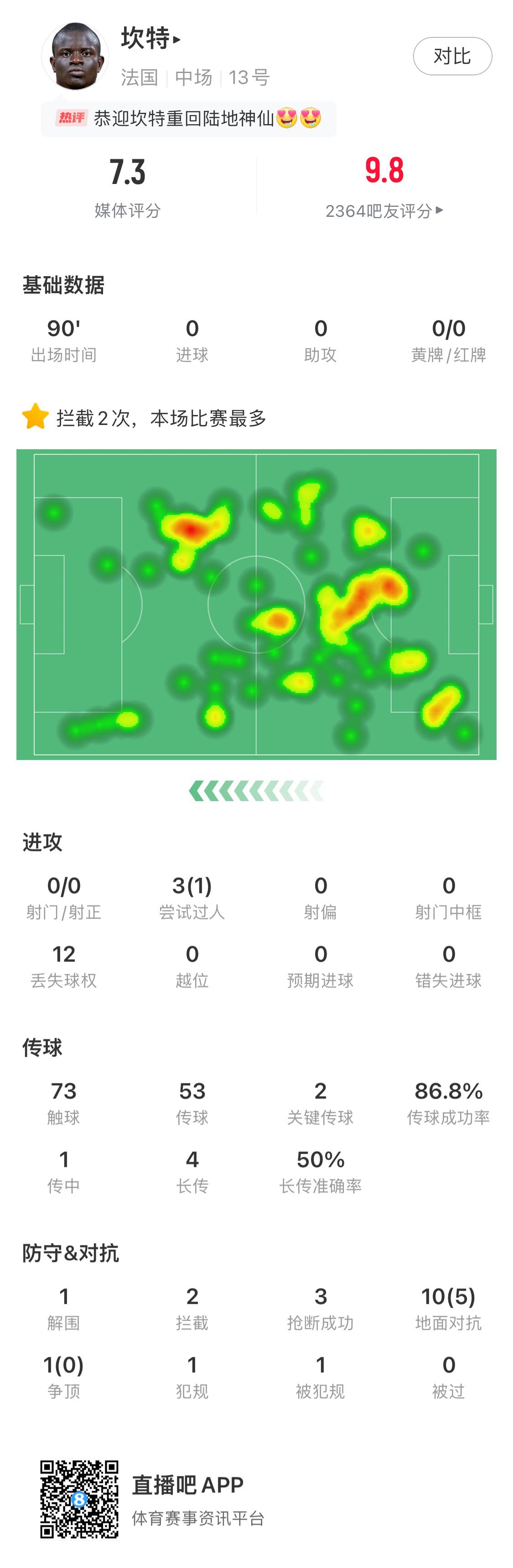 此役坎特跑动11.52km全场最高,贡献1解围、2拦截、3抢断,进攻方面还送出2次关键传球。