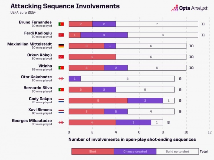 6月19日讯 在欧洲杯小组赛首轮比赛中,B费首发踢满全场,帮助葡萄牙2-1击败捷克。据Opta统计,B费在运动战中参与11次形成射门的进攻,欧洲杯开赛以来并列最多。