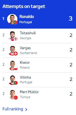 06月19日讯 欧洲杯葡萄牙2-1捷克,本场比赛C罗3次射正,但遗憾没有收获进球。根据统计,C罗的3次射正,在小组赛首轮比赛的所有球员中是最多的。