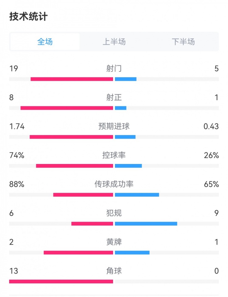 葡捷战数据:射门19-5,射正8-1,控球率74%-26%,角球13-0