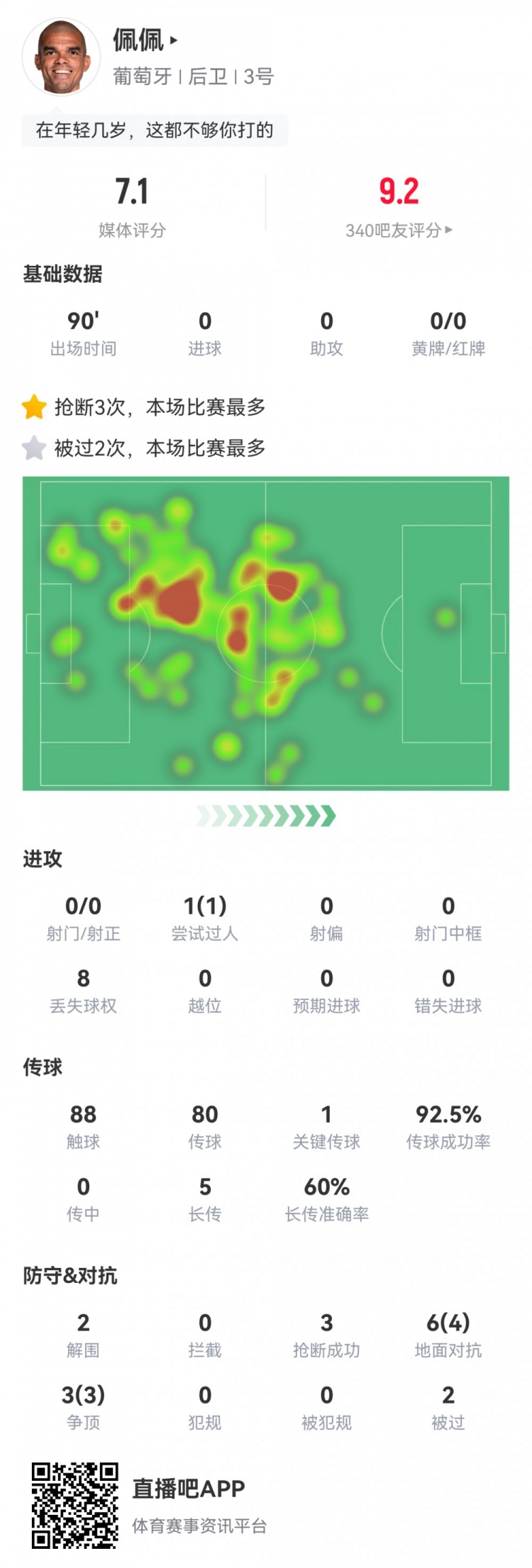 41岁佩佩数据:2次解围,3次抢断,1次关键传球,7次成功对抗