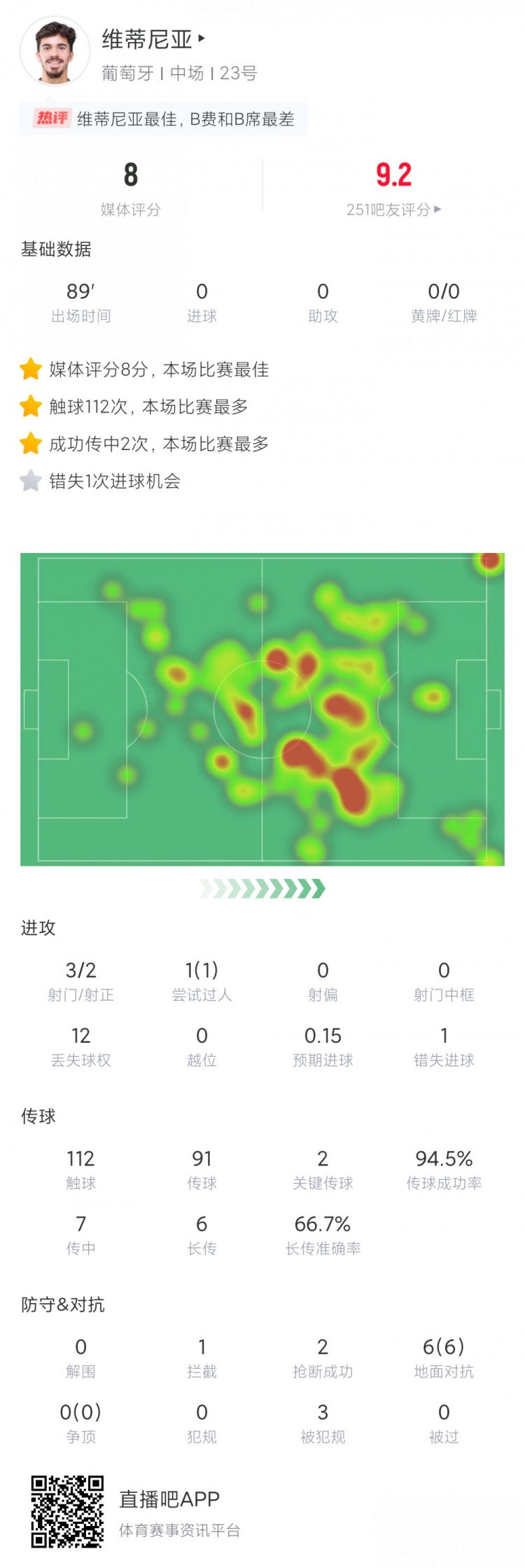 全场数据方面,维蒂尼亚触球112次,全场最多;送出2记关键传球;防守方面贡献1拦截,2抢断,6次地面对抗全部成功!评分8.0全场最高!