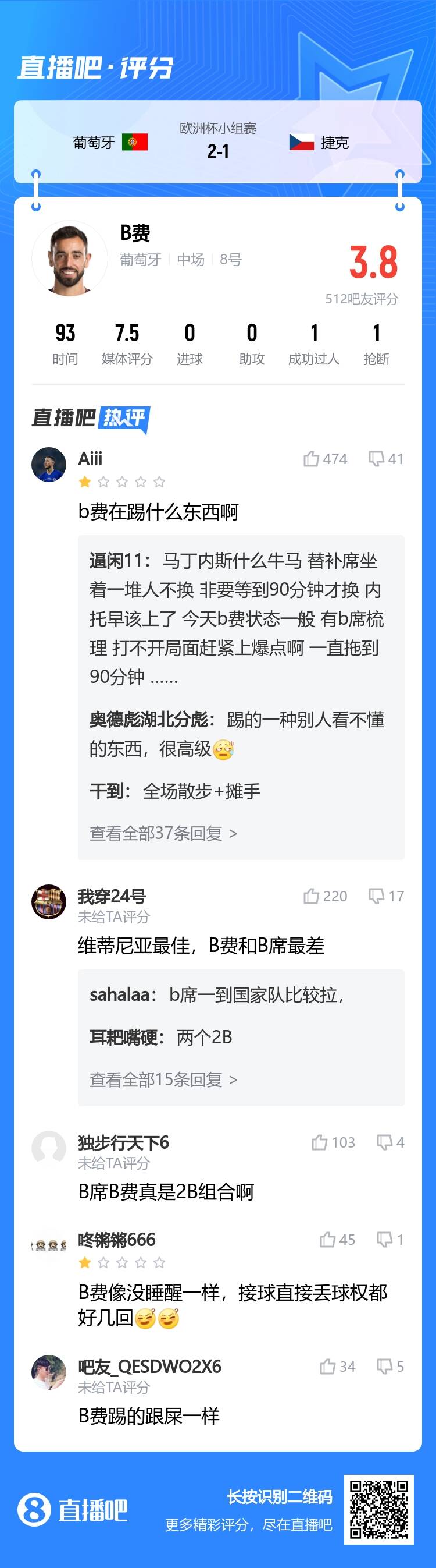 欧洲杯小组赛F组第1轮,葡萄牙2-1绝杀捷克。赛后,吧友为B费打出了3.8分的低分。