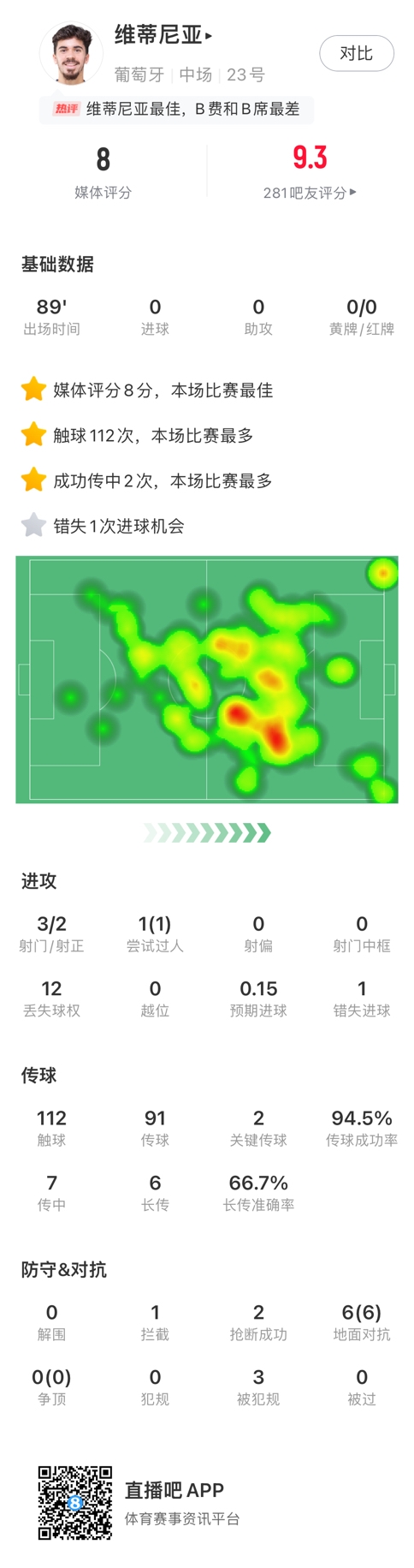 全场数据方面,维蒂尼亚触球112次,全场最多;送出2记关键传球;防守方面贡献1拦截,2抢断,6次地面对抗全部成功!