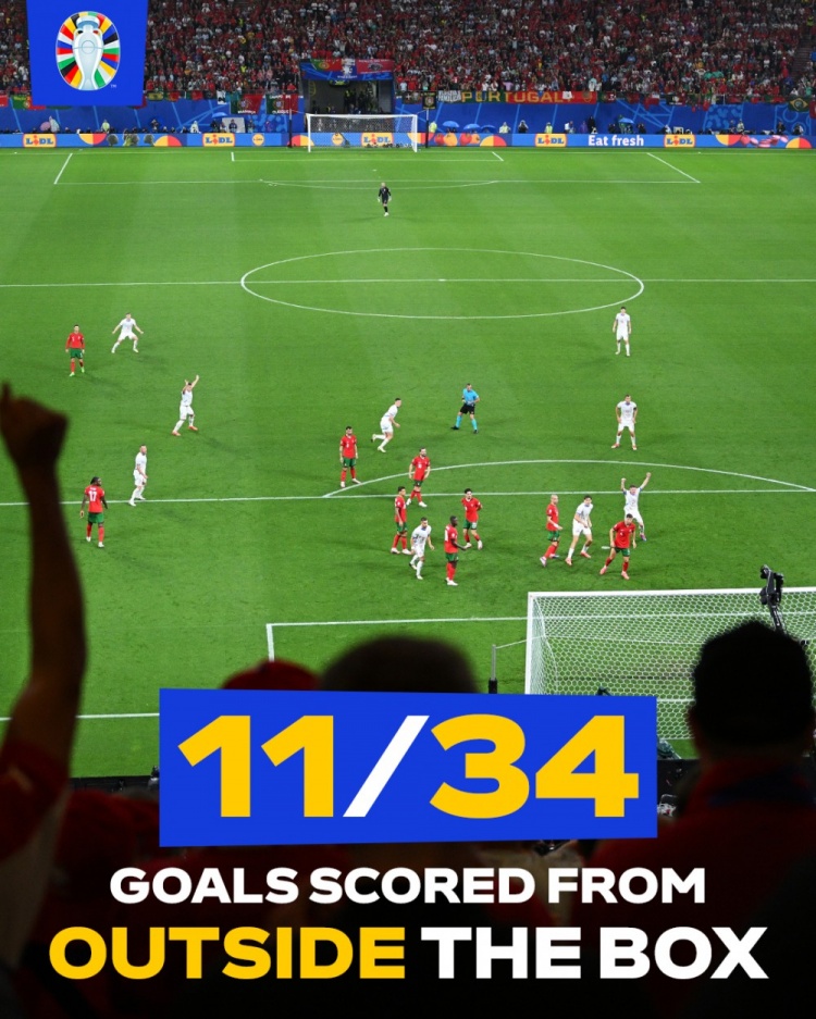 据统计,本届欧洲杯12场小组赛的34粒进球中已出现11粒远射进球。而在上届欧洲杯,全部的51场比赛中也才18粒禁区外进球。