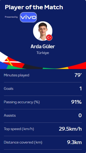 06月19日讯 官方消息,19岁的居勒尔当选土耳其3-1格鲁吉亚全场最佳球员。本场比赛19岁的居勒尔首秀打进一记惊艳的世界波。