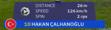 比赛第57分钟,恰尔汗奥卢任意球重炮轰门,格鲁吉亚门将玛玛达什维利单掌将球扑出。恰尔汗奥卢的这一脚射门,速度达到了126km。