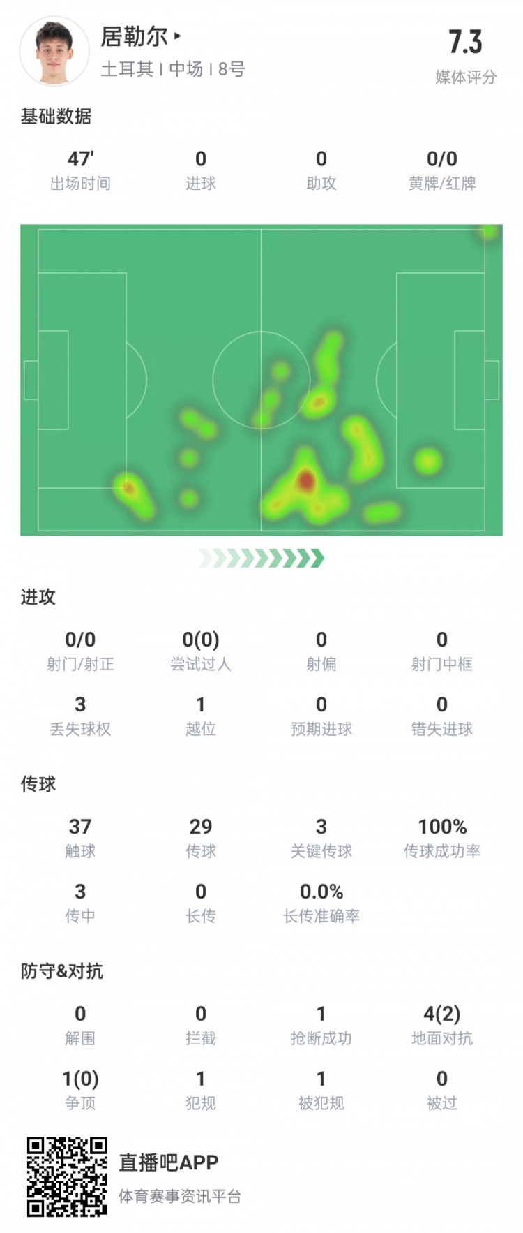 居勒尔半场数据:传球成功率100%,3次关键传球,创造2次良机
