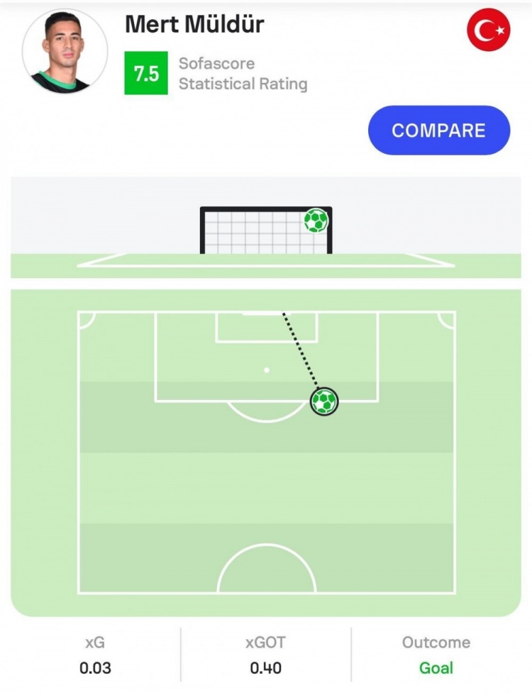 根据sofascore数据,穆尔杜这记世界波的预期进球值仅为0.03。
