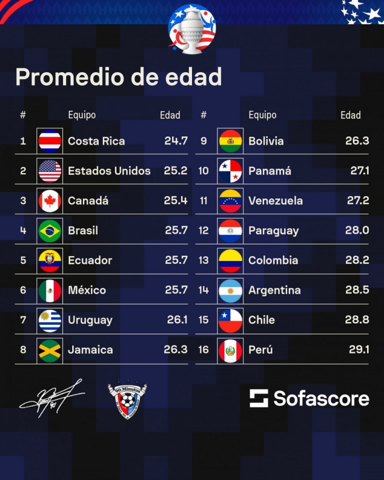 6月20日讯 2024年美洲杯即将开战,Sofascore统计了参加球队的平均年龄,并列出榜单,哥斯达黎加平均年龄24.7岁最年轻,巴西25.4岁第四年轻,阿根廷28.5岁平均年龄第