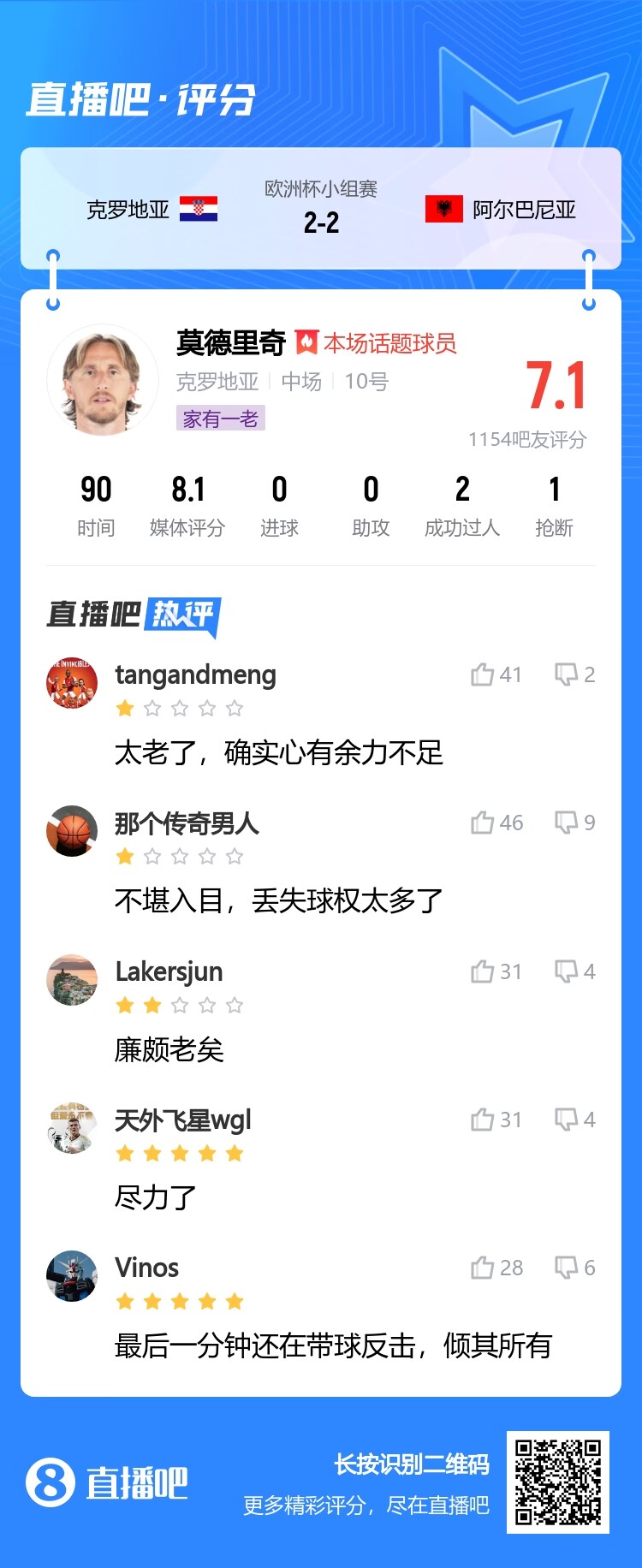 06月20日讯 欧洲杯小组赛第二轮,克罗地亚2-2战平阿尔巴尼亚。莫德里奇首发并踢满全场。赛后吧友们对莫德里奇进行评分时出现了两极分化的现象。有不少吧友