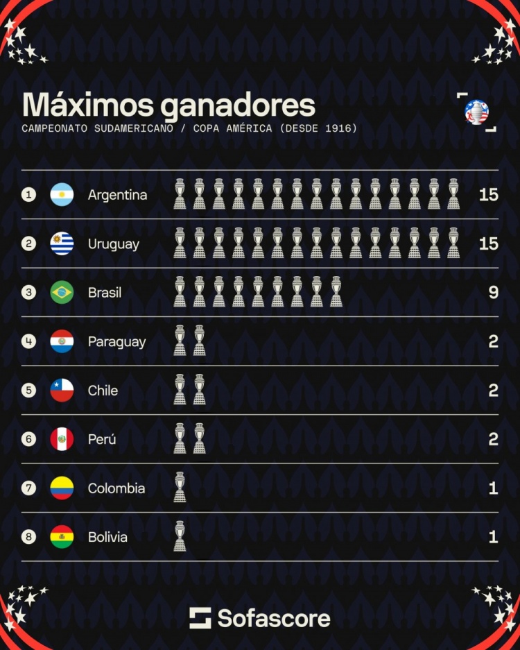 6月20日讯 美洲杯即将拉开帷幕,Sofascored统计了各队历史上夺冠的次数,并列出榜单,阿根廷、乌拉圭15冠居首,巴西9冠排名第三。