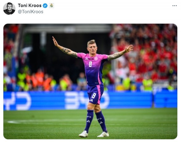 克罗斯本人也在赛后通过个人推特晒出了自己的比赛照片,动作是他经典的双臂平举、双手稍稍抬起的造型,但没有任何配文。