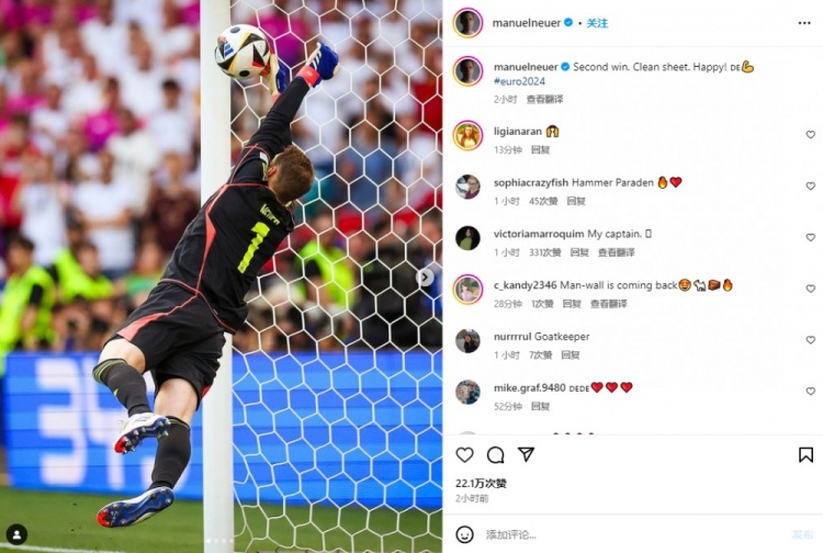 6月20日讯 德国在本轮欧洲杯2-0力克匈牙利,门将诺伊尔贡献多次神扑。他也在赛后通过社媒发文庆祝胜利:“两连胜+零封,开心!”